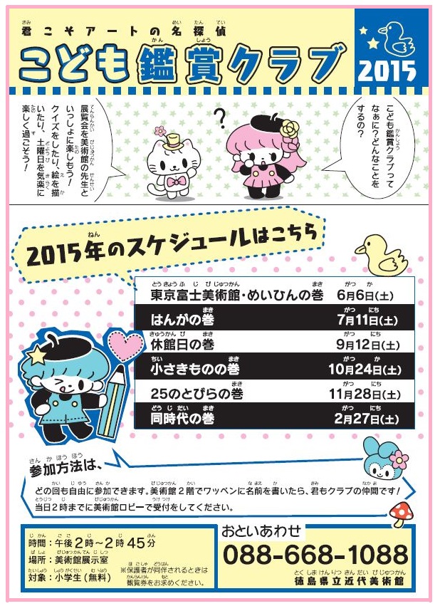 土曜日の小学生たちに送るスペシャルなお楽しみ。遊びの感覚でクイズやツアーをしながら、自分で絵を楽しみ、自分で美術館を楽しむ体験をたくさんしてほしいな。主役は君だ。2時までに受付をして下さい。ロビーで会おう!