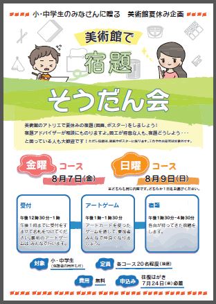 美術館のアトリエで夏休みの宿題(図画、ポスター)をしましょう!宿題アドバイザーが相談にものりますよ。図工が得意な人も、宿題どうしよう・・・と困っている人も大歓迎です!※ただし宿題は、図画やポスターに限ります。工作や自由研究は対象外です。【申込が必要】くわしくは、近代美術館までお問い合わせください。応募受付終了しました。
