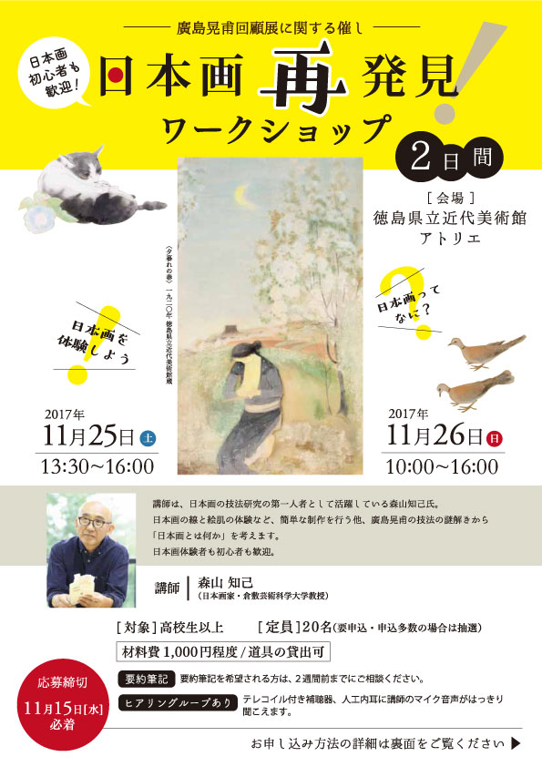 日本画の線と絵肌の体験など、簡単な制作を行う他、廣島晃甫の技法の謎解きから「日本画とは何か」を考えます。
