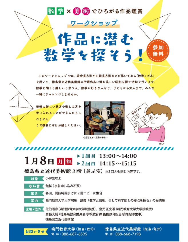 黄金長方形や白銀長方形などが描いてある「数学メガネ」を使って美術作品に潜む美しい図形や比率を探します。子どもから大人まで、数学が苦手な人も一緒に楽しくチャレンジしませんか。鳴門教育大学の大学院生が、「数学メガネ」の使い方をやさしく説明します。(2回とも同じ内容です。)