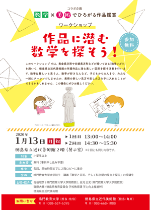 黄金長方形や白銀長方形などが描いてある「数学メガネ」を使って美術作品に潜む美しい図形や比率を探します。子どもから大人まで、数学が苦手な人も一緒に楽しくチャレンジしませんか。鳴門教育大学の大学院生が、「数学メガネ」の使い方などをやさしく説明します。(2回とも同じ内容です)