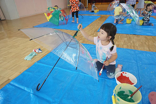 絵を描くことや絵の具の感触がちょっぴり苦手な子も傘に興味津々。躊躇することなく筆を持ち、お絵描きを楽しんでいました。色で隅々まで塗ったり…いろいろな色を使って描いたり…個性がひかる素敵な自分の傘ができました!