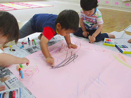 1、2歳児も今年度から「アートの日」をもちました。力強いタッチに子どもたちの主体性を感じ嬉しくなります。