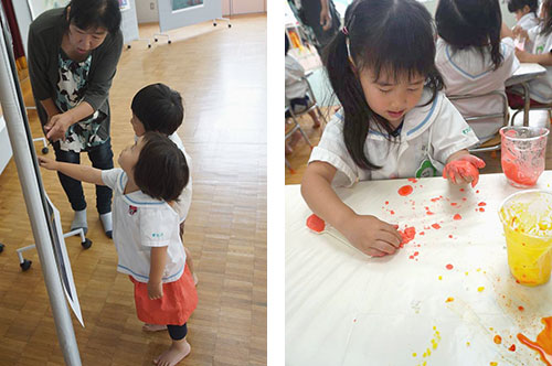3歳児の6月のアートは、近代美術館の亀井先生が来てくださり一緒にあそびました。
