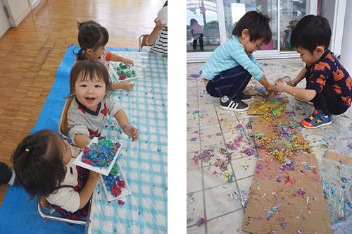 シュレッダー紙を見て「何これ?しらす?」「ちりめん?」と興味を示すひまわり組さん。触ってみると…「ほんま!紙じゃ!」「これが粘土になるん?」「魔法?」とワクワク。