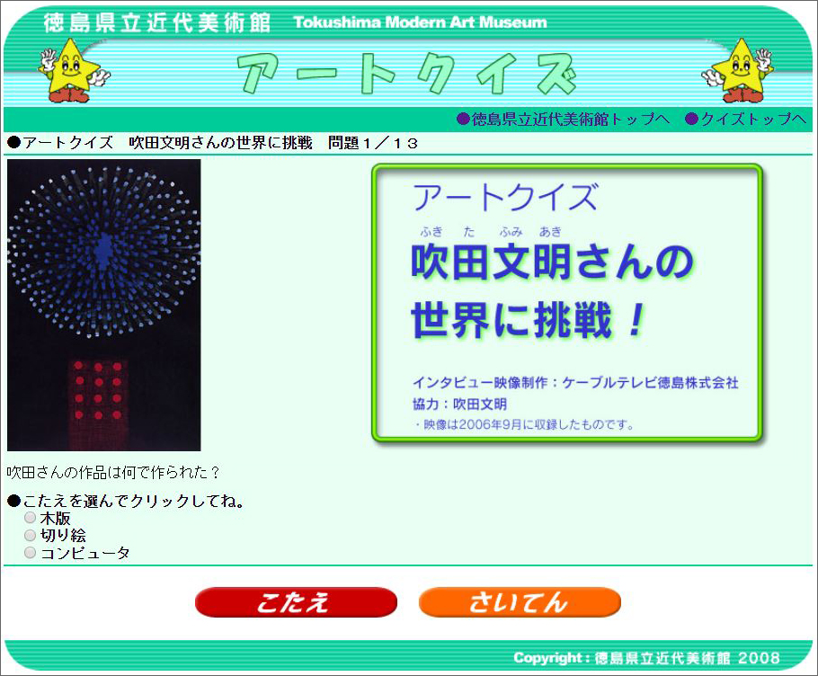◇このクイズ番組は、地域ICT未来フェスタ2008inとくしま・後援事業(ワープ会場)として制作したものです。徳島県立近代美術館の所蔵作品展「徳島のコレクション2008-IV」の「木版画 吹田文明」コーナーの展示にあわせて公開されました。