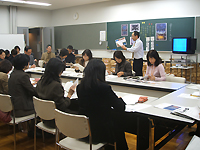 2時間目は、それぞれの学校で実践された「音のかくれんぼ」の輪番制フリートーク。鑑賞遊び「音のかくれんぼ」を軸にしながらも、対象学年や学校の取り組みに合わせた個性的・創造的なシート活用実践が報告された。国語科の学習と合科的に展開した実践や美術館のWeb番組を活用した指導者たちは、「言語活動の充実」や「放送・視聴覚教育」といったそれぞれの学校における研究テーマを駆使したものであった。また、参観日という特別な日を活用することで保護者を巻き込んだ授業、校長先生所有の吹田作品を活用した実物鑑賞など様々な人との関わりや協力を得ることでより豊かな活動を展開させていった実践報告もあった。