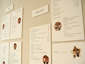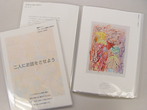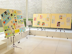 二人ずつのペア学習で生まれた14のお話。7月8日の朗読会のようすをパネルで再現しました。 |