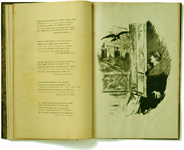 芸術家と本 19世紀末から20世紀前半にかけて、リトグラフを初めとする版画技術が発達し、それにともなって挿絵本、豪華本が盛んに制作されるようになります。特に、20世紀以降は、ピカソやマティス、シャガールなど多くの画家たちが、優れた挿絵本を数多く発表しました。 エドゥアール・マネの<大鴉>は、エドガー・アラン・ポーの詩をステファヌ・マラルメが仏訳しマネが挿絵を付けたもの。1875年に刊行されました。発案者はマラルメです。左頁に英語の原詩が、右頁に仏訳が印刷されていて、 マネとマラルメの出会いは1874年のことです。マネはその年のサロン(フランスの官展)に落選してしまいますが、マラルメはその審査への批判を行ったのです。頑迷なサロンという権威の壁に挑んだマネ。当時まだ十分に知られていなかったポーに着目し紹介を試みたマラルメ。画家と詩人、二人の若き先覚者によって実現した先駆的な作品です。 ● ● ● カンディンスキーは、自身の詩と版画による詩画集<響き>(1913年刊)を出します。その版画には、ところどころ具象的な形態が現れてはいますが、それらはカンディンスキーの心の動きの瞬間を捉えた即興的な形です。そんな形と、色、そして言葉と音とリズムが「響き」合って魅力的な世界が生まれました。 バルザックの小説『知られざる傑作』に出てくる老画家フレンホーフェルは、理想の女性を求め、想像上のモデルを見つめて女性を描き続けます。描いては消し、塗り重ね、狂気に至りながら彼が描き上げたのは等身大の裸婦像。そこには、常軌を逸した意味をなさない色と線の固まりしか見えませんでした。抽象絵画が誕生する寓話を思わせるこの物語にピカソは挿絵を寄せます(1931年刊)。そこで、ピカソは生涯のテーマとなった「画家とモデル」のモチーフを獲得しました。 詩や物語と美術が出会い、競演するとき、本は格好の舞台となっているのです。 図版: エドゥアール・マネ<大鴉> |