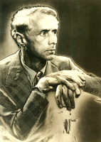 この作品は、マン・レイとともにパリのシュルレアリスム運動に参加した優れたアーティスト、マックス・エルンストの肖像写真です。エルンストの体の周囲や下部が白く光を放つように輝き、輪郭は黒く縁取りされています。