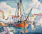 シニャックらがおこなった点描とは、印象派が色を混ぜずに描いた方法を徹底し、捕色関係などの科学的な色彩理論を応用しながら、色をそのまま画面に置いていく方法です。光を分光すると、光の色は波長の順に分かれてならびます。キャンバスに置かれた色の点は、いわばこの光のスペクトルのようなものです。そして色の点を光の場合と同様に、人間の眼の網膜の上で混ぜ合わせようという、それは画期的な方法論でした。そこでは絵の具の色の明るさは減じることがありません。この考え方は、現在ではカラー印刷の原理にもつながっています。 シニャックの<サン・トロペの港>(1923年)に見られる色の点の形は、やや大ぶりの長方形で、全体に力強さと明快さが感じられます。 | ||||||