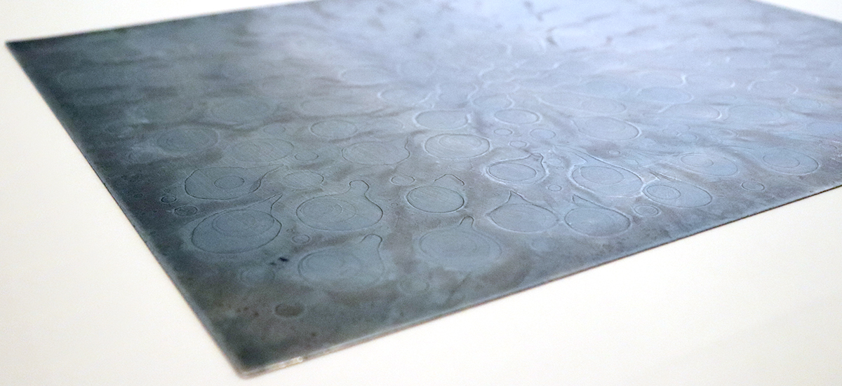 腐蝕をあやつる 終わりのない実験 腐蝕をあやつる -形、現象、地層- 不可思議な映像は、描いたというより薬品のしぶきや流れにまかせて偶然に生じた痕跡です。作家はどれほどの絵柄ができるか知らずに実験を繰り返しながら「表現」を見い出そうとします。